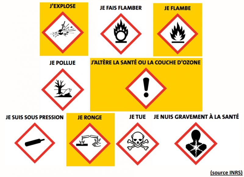 Les Pictogrammes de danger chimiques et toxiques (Cf. Image) répondant à la réglementation Européenne CLP ( n°1272/2008).